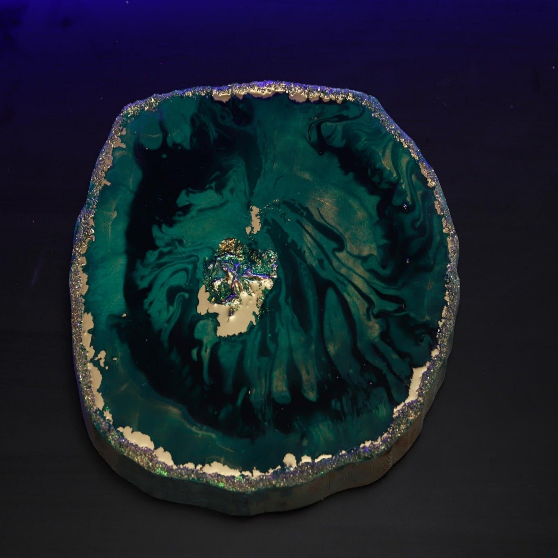 • Ζωγραφική πάνω σε φέτα ξύλου οξιάς, δουλεμένο με σμάλτο, σκόνες λάμψης, κρυστάλλους και υγρό γυαλί.