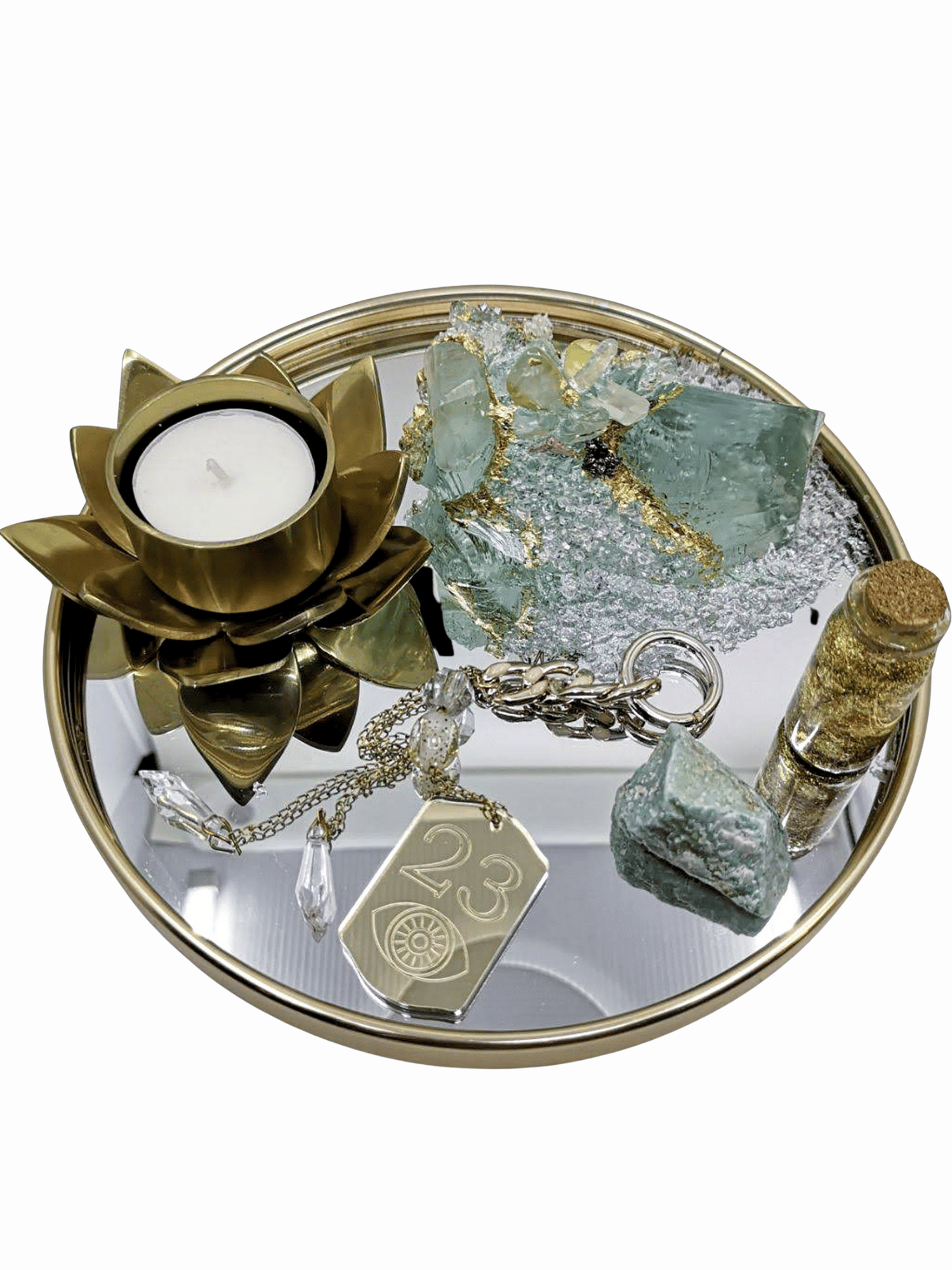 Συλλεκτικό, μοναδικό, γούρι που δημιουργήθηκε τον Οκτώβριο του 2022. 'Ένας στρογγυλός δίσκος με καθρέφτη, διαμετρου 20cm, φιλοξενεί μια χρυσή βάση για ρεσώ που έχει στόχο να προσφέρει θαλπωρή στον χώρο, και ενέργεια στην κυρίαρχο χαλαζιακό κρύσταλλο.